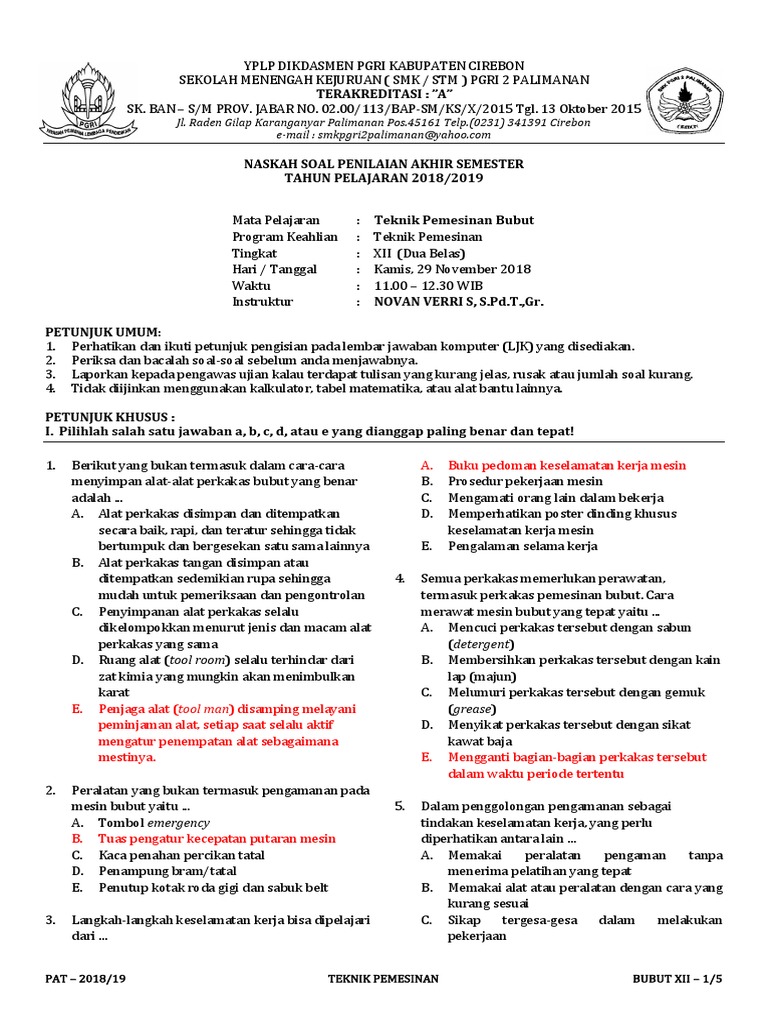 Kumpulan soal produktif otomotif beserta jawaban imronsoal uts tmkr2 kelas xi tkr sistem pendingin dan sistem bahan bakar b. Kerjakan soal dibawah ini dengan benar dan tepat, untuk mengukur kemampuan penguasaan materi teori teknik pemesinan frais merupakan salah satu standar kompetensi yang harus dipelajari dan dikuasai oleh siswa yang belajar di smk kompetensi. Latihan soal simdig usbn #1 pilihlah salah satu jawaban yang paling benar dengan cara member tanda. Benda kerja akan dibubut dengan putaran mesinnya (n) 300 rpm dan besar pemakanan (f) 0,1 mm/putaran. Siswa teknik pemesinan kelas xi smk bidang keahlian teknik pemesinan dalam mata.