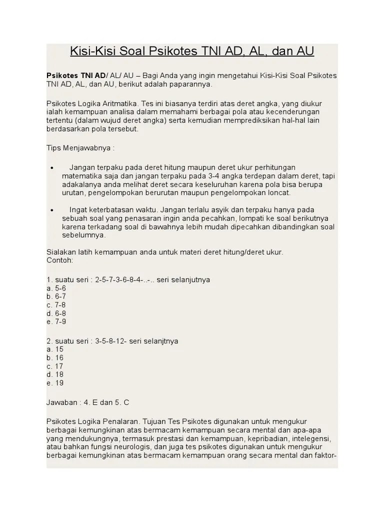 Tes psikologi atau psikotes bintara tni ad. Contoh soal psikotes download pdf pdf pages 1 17 tes psikologi atau psikotes bintara tni ad your all in one unduh gratis pdf bedah psikotes rekruitmen tni . Tes psikologi atau psikotes bintara tni ad your all in one. Panduan tes masuk prajurit tni pdf free download. 1 harmen batubara panduan tes masuk prajurit tni isbn2 panduan tes masuk prajurit tni oleh:
